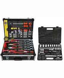 Dieses ist ein universaler Werkzeugkoffer. Der Inhalt richtet sich an arbeiten rund ums Haus, sowie Reparaturen an Fahrzeugen vom Auto bis hin zum Fahrrad. Eine Werkzeuge die zum Schrauben verwendet werden sind aus Chrom Vanadium Stahl hergestellt. Das Set besteht aus zwei Koffer. Der größere besitzt an den längst kannten stabile Aluminium Profile. Ebenso im Mittelrahmen. Der Boden, die Seitenflächen sowie der Deckel sind verstärkt hergestellt. Unter den zwei herausnehmen baren Werkzeuge Paletten befindet sich im Koffer Boden eine variabel Fächer Einteilung. Diese kann zur Selbst Bestückung mit Werkzeug benutzt werden oder für das Lagern von Material. Der Haub Koffer ist bestückt mit einem 300 g Schlosser Hammer. Der Stil ist aus Glasfaser. Zum besseren Halt gegen Abrutschen ist der Griff mit Kunststoffe ummantelt. Die Wasserpumpen Zange besteht aus Chrom Vanadium Stahl. Zur Sicherheit ist sie mit einem Klemm Schutz ausgerüstet. Die Schneide der Kombizange ist induktiv gehärtet. Die Griffe der Schraubenzieher mit Schlag fest. Den kompletten Inhalt des Hauptkoffers sehen sie in folgende Aufstellung.